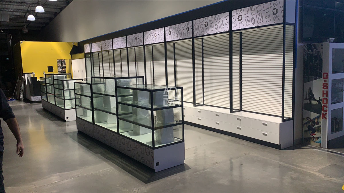 Glass showcases with a 45° mitre joint corner process, it makes the joint smoother and looks high end, completely eradicate the glue mark on the corner.