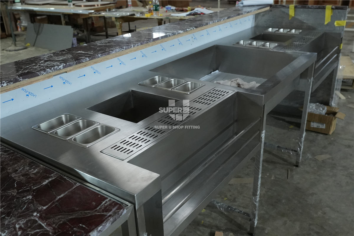 The project therefore commenced with design engineering to organise service flow and introduce a modular structure that supports flexible seating while improving traffic flow between counter and dining areas. Shop drawings development translated these strategies into precise fabrication details, particularly where integrated storage systems and service points needed to remain accessible without interrupting the overall spatial clarity. During prototyping and sample development, refinements were made to multi-material integration, balancing metal, laminate, and timber elements to achieve both durability and consistent visual expression.
